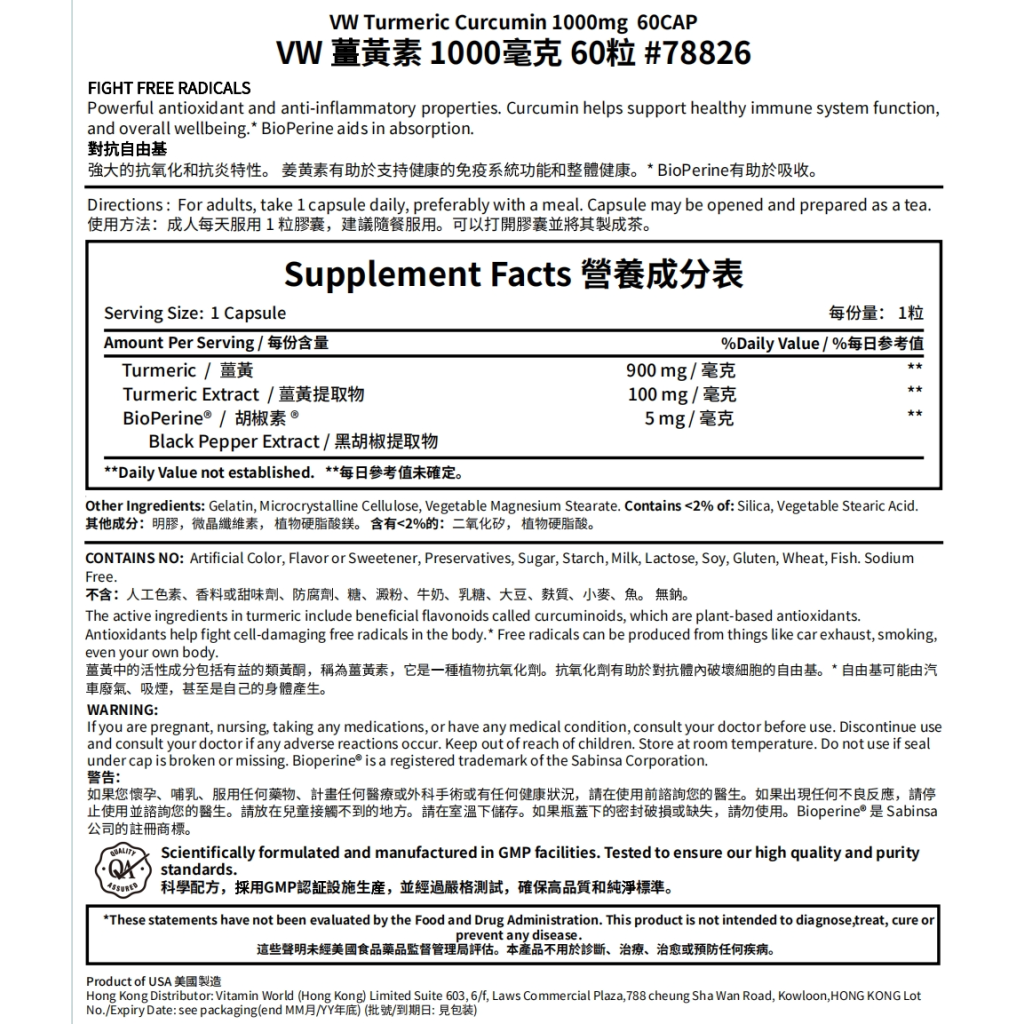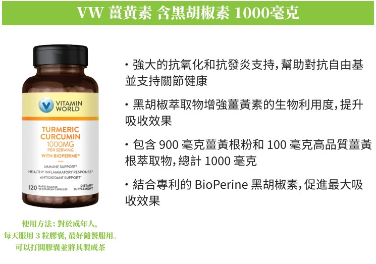 强大的抗氧化和抗炎特性。 薑黃素有助於支持健康的免疫系統功能和整體健康。*BioPerine有助於吸收。