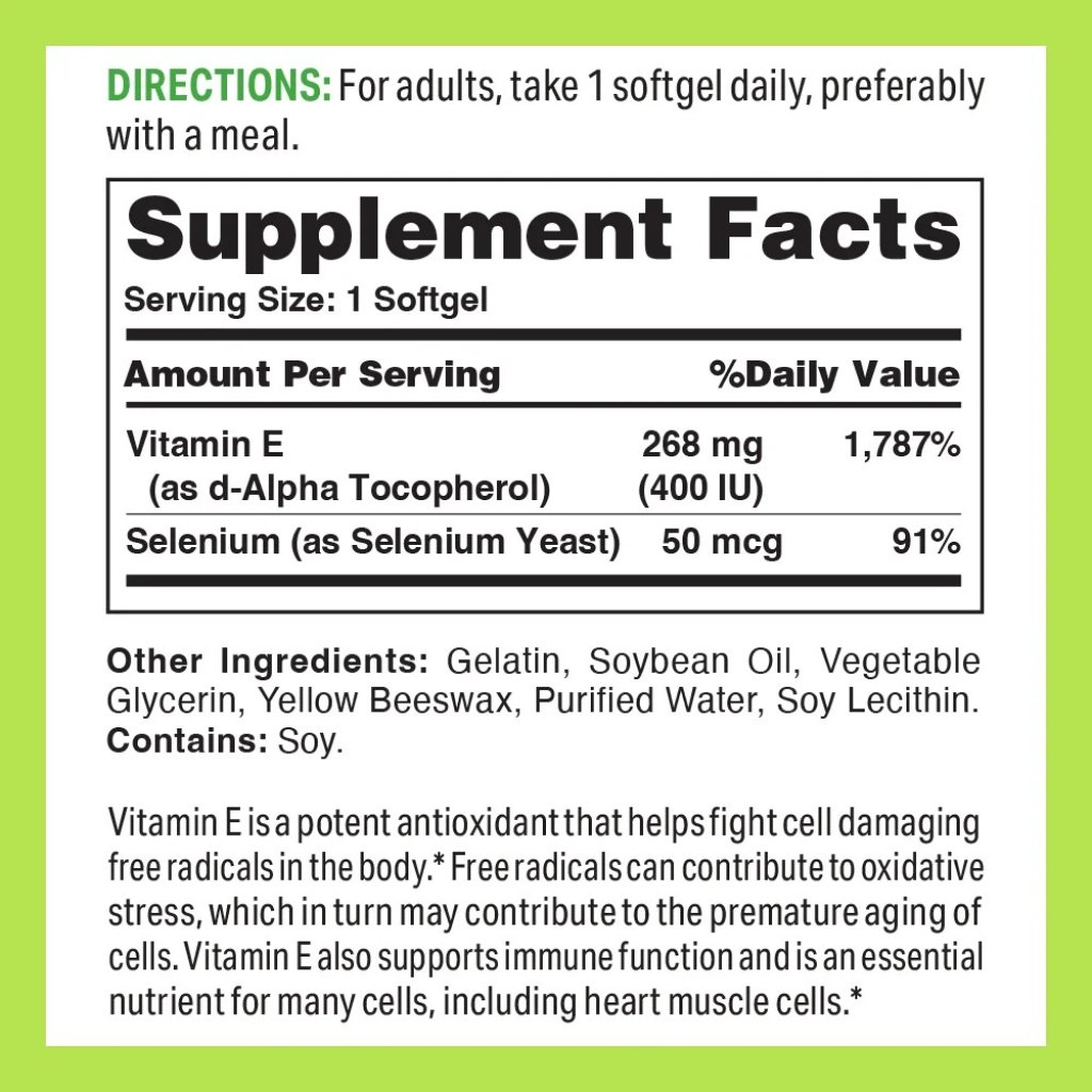 有助於減少炎症並增強免疫力。* 強效抗氧化劑組合可降低炎症,同時增強免疫功能。維生素E是一種強效抗氧化劑,有助於對抗體內導致細胞損害的自由基。* 自由基可能導致氧化壓力,進而導致細胞的過早老化。維生素E還支持免疫功能,是許多細胞(包括心肌細胞)的必需營養素。