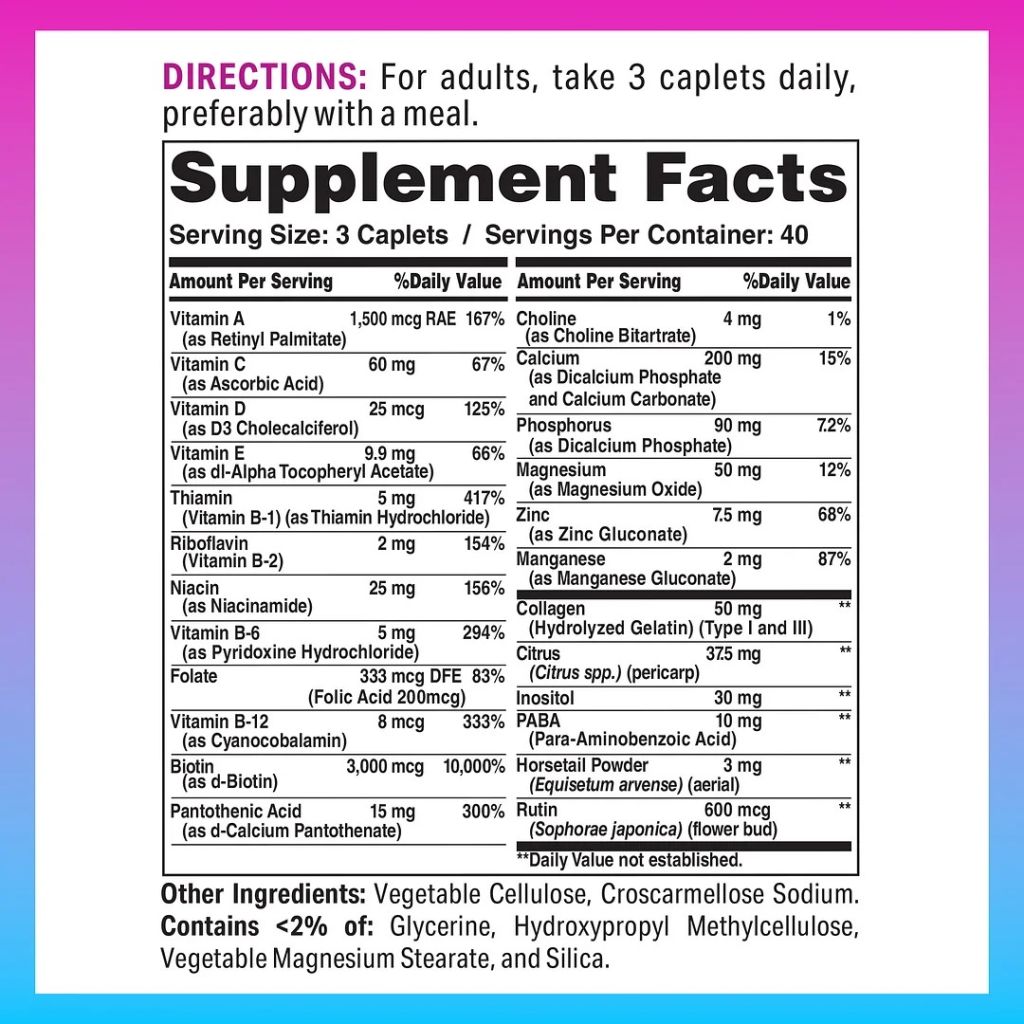 通過使用頭髮、皮膚和指甲配方,讓頭髮更濃密,指甲更堅韌,肌膚更年輕。* I型和III型膠原蛋白、生物素及必需維生素可幫助減少細紋和皺紋的出現。