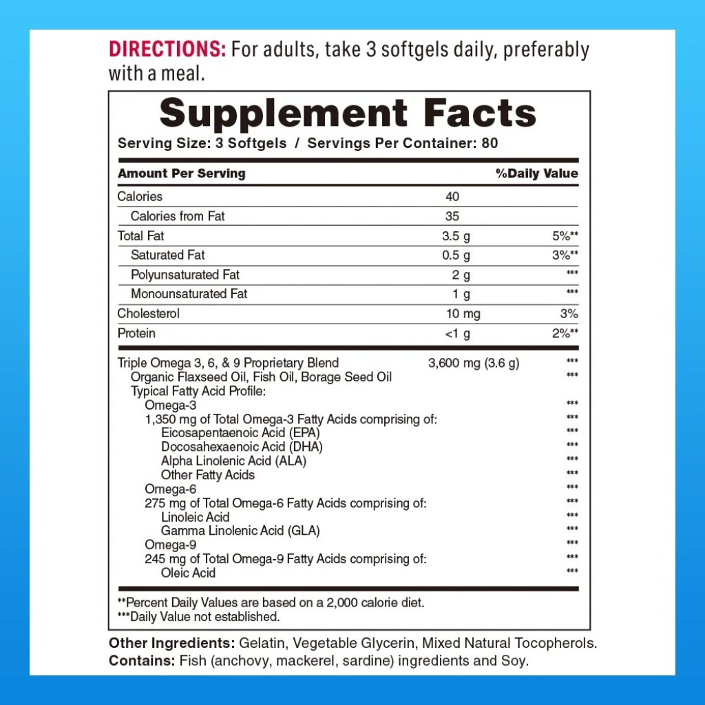 三重歐米茄3,6,9含有全面的營養油混合物,提供活性EPA/DHA,有助於心臟、神經和關節健康。