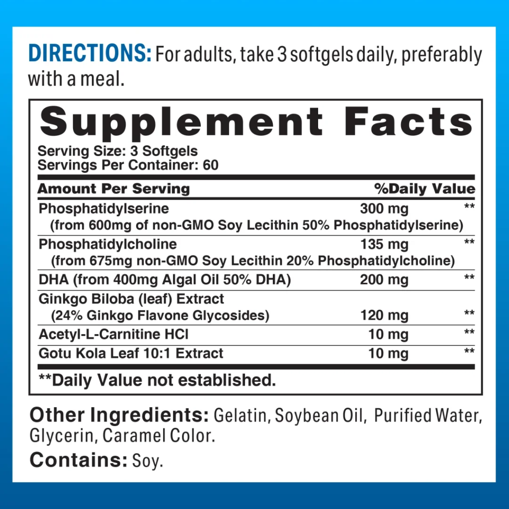 改進嘅配方,改進嘅大腦功能!為咗保持最佳表現,您的大腦都需要營養。 我哋而家包括200 毫克嘅大腦超級營養素磷脂酰膽鹼以及更高水平嘅 DHA。 呢度仲有腦力英雄磷脂酰圍氨酸同銀杏葉嚟支持您的認知功能。