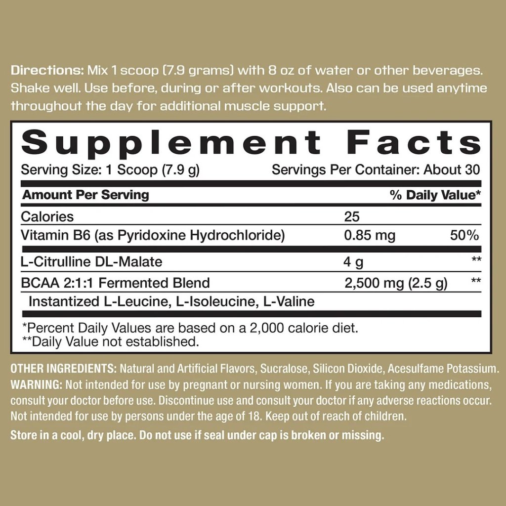 精密工程支鏈氨基酸+瓜氨酸蘋果酸每份提供 2.5 克支鏈氨基酸( BCAA )與 4 克 2:1 瓜氨酸蘋果酸復合。支鏈氨基酸支持肌肉蛋白質嘅構建以及劇烈訓練之後嘅修復。科學配方,以 2:1:1*嘅肌肉蛋白質比例提供铁衍生嘅支鏈氨基酸-亮氨酸、異亮氨酸同繒氨酸
