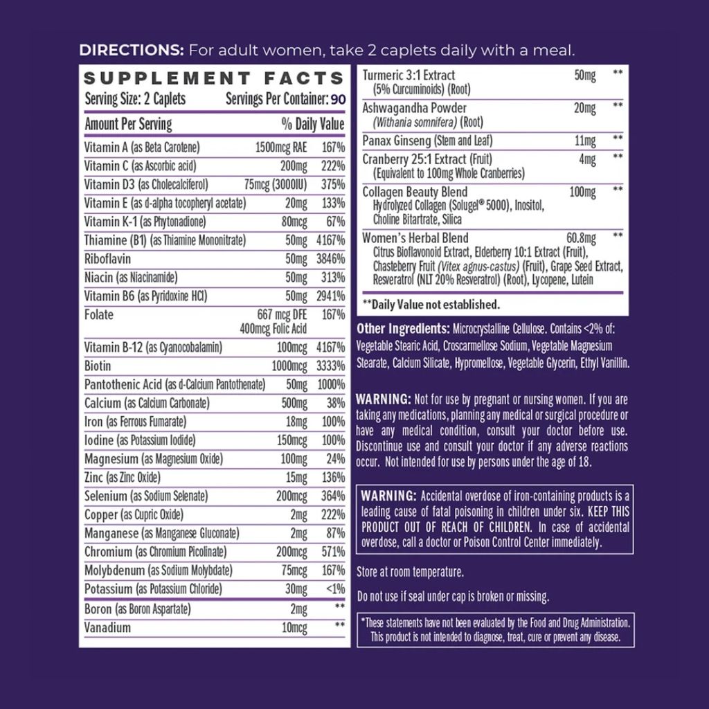 Directions:For adult women,take 2 caplets daily with a meal.建議食用:適用於成年女性,每日随餐服用2粒。
